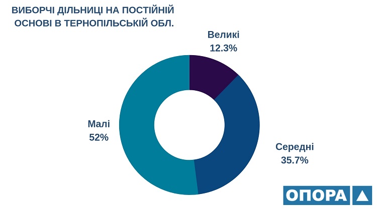 За інформацією з офіційного сайту Державного реєстру виборців, на території Тернопільської області є 1182 виборчих дільниці, що утворені на постійній основі. З них кількість малих становить 615, середніх – 422 та великих – 145 дільниць.
