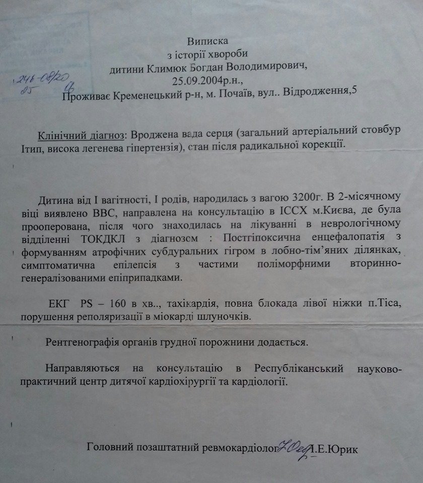 “Звертаюсь до усіх небайдужих людей. Мою сім’ю спіткало велике горе. Я довго чекала на своє щастя, своє сонечко, свого синочка Богданчика. Коли народився Богданчик, лікарі сказали, що все добре, дитина здорова. Але у півтора місяці, ми звернулись у лікарню з простудним захворюванням (так як я тоді думала). Але, коли дитину обстежили, нас просто шокували слова лікаря. У мого синочка виявили вроджену ваду серця”, – розповідає мама Тетяна Климюк.