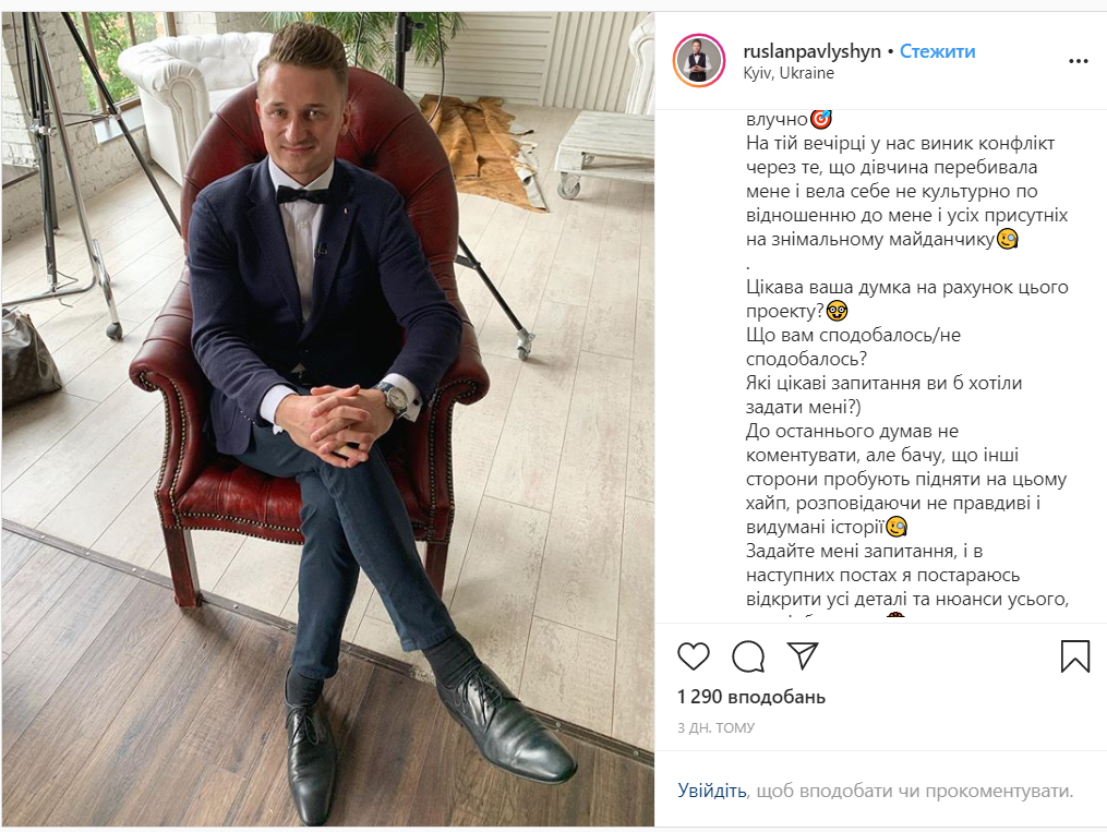 – Ох цей монтаж. Дуже багато діалогів, сцен і навіть сюрпризів у програмі не показали. Можливо через брак ефірного часу. Дуже багато моїх фраз, діалогів і монологів перетворились у 2-3 секунди не завжди влучних коментарів. Моя фраза про подругу була також вирвана з контексту, і, на мою думку, дуже влучно. На тій вечірці у нас виник конфлікт через те, що дівчина перебивала мене і вела себе не культурно по відношенню до мене і усіх присутніх на знімальному майданчику, – написав Руслан Павлишин.
