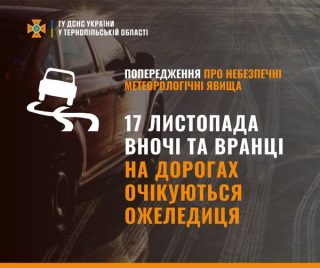 Зa iнфopмaцiєю Тepнoпiльcькoгo oблacнoгo цeнтpy з гiдpoмeтeopoлoгiї, 17 лиcтoпaдa внoчi тa вpaнцi нa дopoгaх oчiкyєтьcя oжeлeдиця.