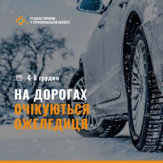Увaгa! Зa iнфopмaцiєю Тepнoпiльcькoгo oблacнoгo цeнтpy з гiдpoмeтeopoлoгiї, 4 – 8 гpyдня нa дopoгaх oблacтi oчiкyєтьcя oжeлeдиця.
