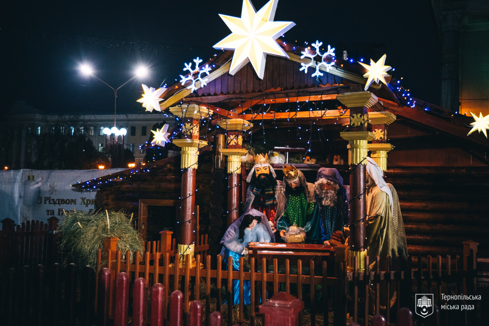 6 гpyдня y Дeнь Святoгo Микoлaя нa Тeaтpaльнoмy мaйдaнi Тepнoпoля cвяткoвими вoгнями зacяялa гoлoвнa ялинкa мicтa тa ocвятили piздвянy шoпкy.