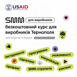 21 березня у Тернополі стартує безкоштовний курс «SMM для виробників», за підтримки Програми USAID «Конкурентоспроможна економіка України». Наразі проводиться набір другого потоку учасників серед виробників, підприємців з виробничими потужностями тощо.