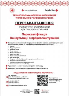 Тернопільська обласна організація Товариства Червоного Хреста України, в рамках проєкту «Перезавантаження: розширення можливостей для працевлаштування», за підтримки Іспанського Червоного Хреста та Швейцарського Червоного Хреста, надає допомогу з працевлаштування, навчання, перенавчання, підвищення або підтвердження кваліфікації внутрішньо переміщеним особам та особам вразливих категорій місцевого населення.