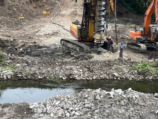 Після перенесення водогону багатотонний буронабивний кран почав робити свердловини під останню, третю опору мосту в Теребовлі. У пробурені свердловини заливаємо бетонну суміш, щоб встановити арматурний каркас майбутніх паль. Уже влаштували 17 з 24 паль.