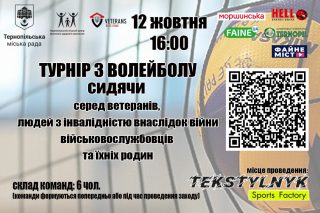 Запрошуємо військовослужбовців, ветеранів та людей з інвалідністю внаслідок війни, їхні родини і всіх охочих взяти участь у турнірі з волейболу сидячи, який відбудеться 12 жовтня о 16:00 год в спортивному комплексі «Текстильник».