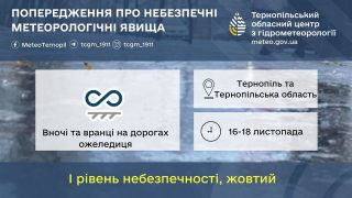 За інформацією, 16-18 листопада вночі та вранці на дорогах ожеледиця.