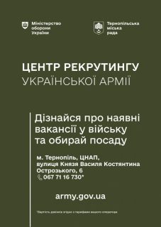 Тернополі працює центр рекрутингу української армії, де можна отримати консультації за адресою: вул. Князя Василя Костянтина Острозького, 6, ЦНАП.