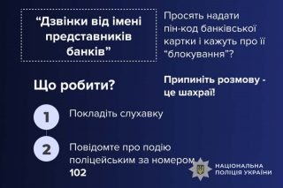Правоохоронці вкотре наголошують: жоден працівник банку ніколи не проситиме у клієнта назвати пін-код, CVV-код чи паролі з SMS. Ця інформація є конфіденційною і не може передаватися навіть у випадку, якщо вам телефонує «служба безпеки».