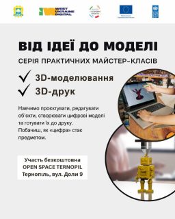 У Тернополі стартує серія безкоштовних майстер-класів із 3D-технологій у межах проєкту «Портфоліо міських трансформацій». Захід організовує Open Space Ternopil. Під час майстер-класів кожен охочий зможе пройти шлях від створення цифрової моделі до виготовлення реального виробу.