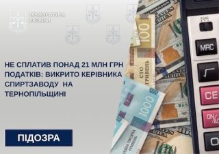 За процесуального керівництва Тернопільської обласної прокуратури в.о. керівника підприємства спиртової галузі викрито в умисному ухиленні від сплати податків. Його дії призвели до ненадходження коштів до державного бюджету в особливо великих розмірах. Розпочато розслідування за ч. 3 ст. 112 КК України.