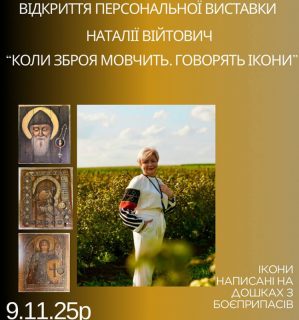 У неділю, 9 листопада, о 14:00 у читальному залі Тернопільської міської бібліотеки №4 для дорослих «Етно-Центр» відкриється персональна виставка ікон майстрині іконопису та волонтерки Наталії Війтович під назвою «Коли зброя мовчить, говорять ікони».