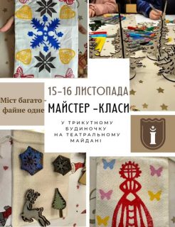 - 15 листопада, 13:00–17:00 – майстер-клас з декорування новорічного мішечка в техніці вибійка;