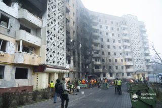 У будинку на вулиці 15 квітня тривають ремонтні роботи після руйнувань, спричинених ракетною атакою. Наразі проводяться першочергові заходи: вікна будівлі закривають плівкою, а також здійснюється відкачування води з підвалу. Паралельно проводиться обстеження двох під’їздів, де квартири зазнали значних пошкоджень, частково вигоріли.