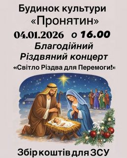 У Будинку культури «Пронятин» у неділю, 4 січня 2026 року, відбудеться благодійний різдвяний концерт «Світло Різдва для Перемоги». Початок заходу – о 16:00.