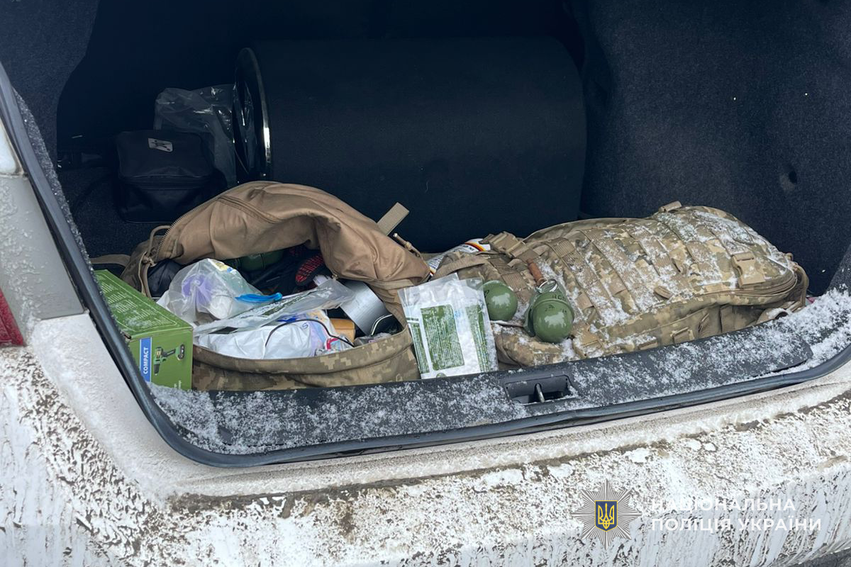 Під час поверхневого огляду автомобіля в багажному відділенні правоохоронці виявили камуфльований рюкзак одного з пасажирів. Усередині знаходилися три гранати РГД-5 із запалами, 89 патронів калібру 5,45 мм та димова граната.
