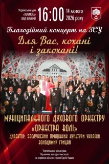 Муніципальний духовий оркестр «Оркестра Волі» запрошує тернополян і гостей міста на благодійний концерт «Для Вас, кохані і закохані!». Захід, присвячений Дню святого Валентина, відбудеться у суботу, 14 лютого, в Українському домі. Початок дійства – о 16:00.
