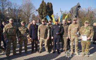 Серед присутніх – представники поліції – саме вони стали основою добровольчих батальйонів, що з 2014 року брали активну участь у антитерористичній операції а згодом – в операції об’єднаних сил. Сьогодні добровольці-поліцейські у складі стрілецьких батальйонів та інших формувань боронять країну на фронті.