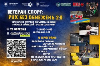29 березня у Тернополі в комплексі Текстильник Sports Factory відбудеться День спортивних майстер-класів «Ветеран Спорт «Рух без обмежень 2.0». Захід об’єднає ветеранів, військовослужбовців, учасників бойових дій, людей з інвалідністю внаслідок війни та їхні родини.
