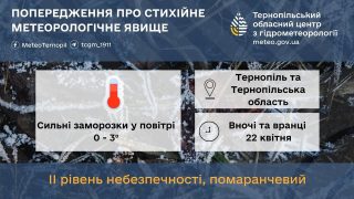 Увага: Помаранчевий рівень небезпеки! На Тернопільщині очікуються сильні заморозки 22 квітня ПОПЕРЕДЖЕННЯ Область: 22 квітня вночі та вранці сильні заморозки у повітрі 0..-3°. Місто: 22 квітня вночі та вранці сильні заморозки у повітрі 0..-2°. (ІІ рівень небезпечності – помаранчевий, СМЯ ІІ) Share FacebookTwitterWhatsAppPinterestEmailTelegramViberPrint